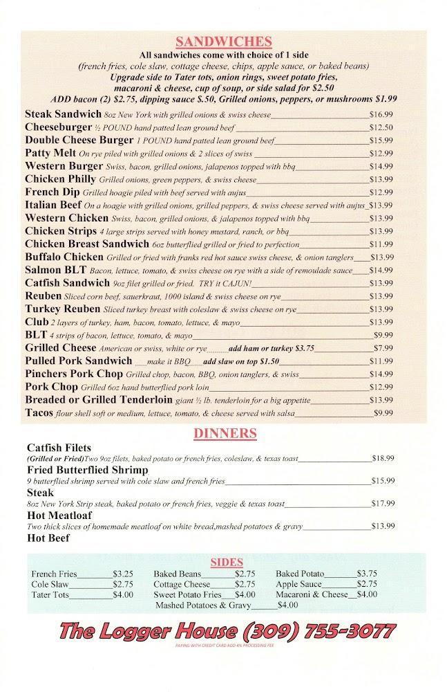 The Logger House boasts a diverse menu filled with satisfying dishes. Options range from hearty sandwiches to fresh salads. Signature items include the standout pork chop sandwich and savory wraps. Diners can also explore a selection of comforting classics like catfish filets and tender steaks.